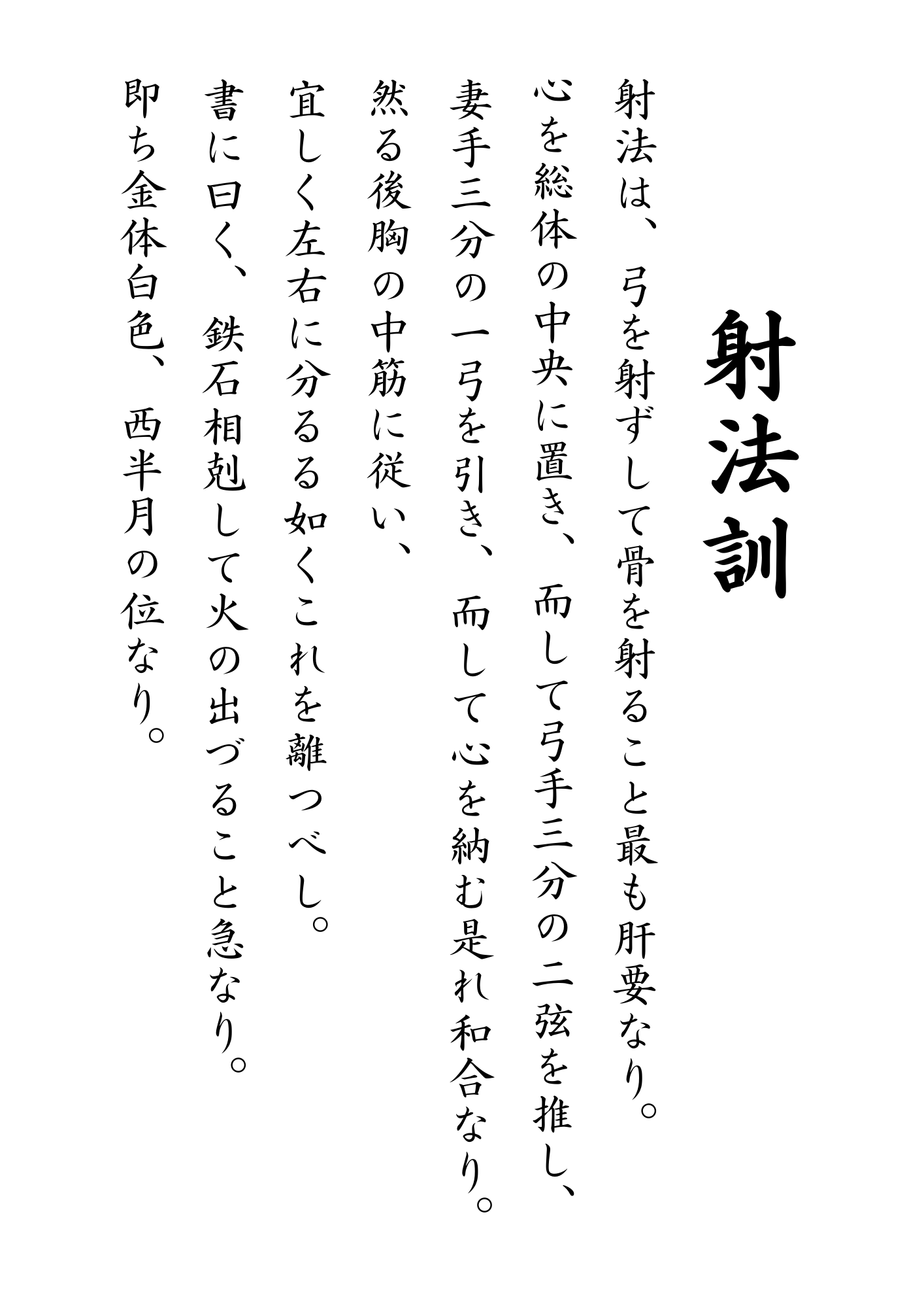 Colocar o espírito (Kokoro), no centro de todo o corpo, com dois terços de Yunde (braço esquerdo) empurrar a corda, e com um terço de Mete (braço direito) puxar o arco. Espírito assente, assim se forma a unidade harmoniosa.